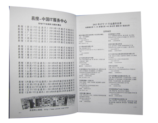 在国庆佳节到来之际,易搜在出刊了陕甘宁新蒙晋津七个地区的IT行业通讯录后,又将目光投向了东北市场,在国庆佳节之前,易搜加紧了对辽宁地区的IT行业通讯录的录入审核调整工作并印刷出刊,辽宁是我国重要的老工业基地,又是新中国工业崛起的摇篮,与日本、韩国隔海相望,占有极大地天时地利优势,因此在辽宁地区需要IT渠道信息的商家绝不在少数。易搜经过长期的前期市场调研和后期的整合编辑工作,这本易搜《辽宁IT行业通讯》2013年9月版终于在在今天(2013-9-27)终于出版了!!